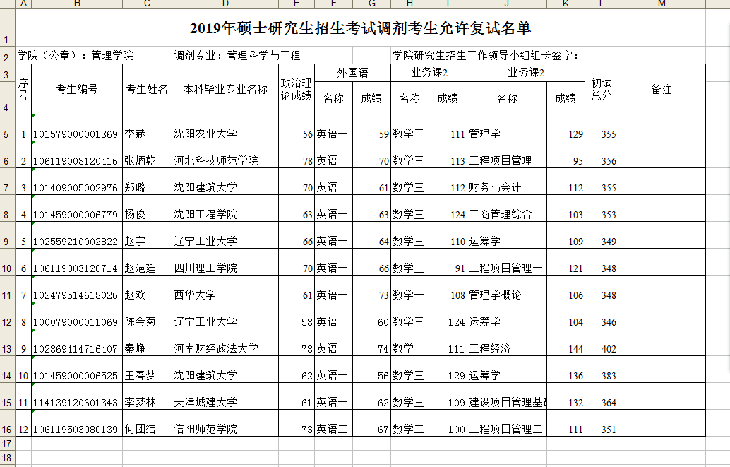 2019年硕士研究生招生考试调剂考生允许复试名单