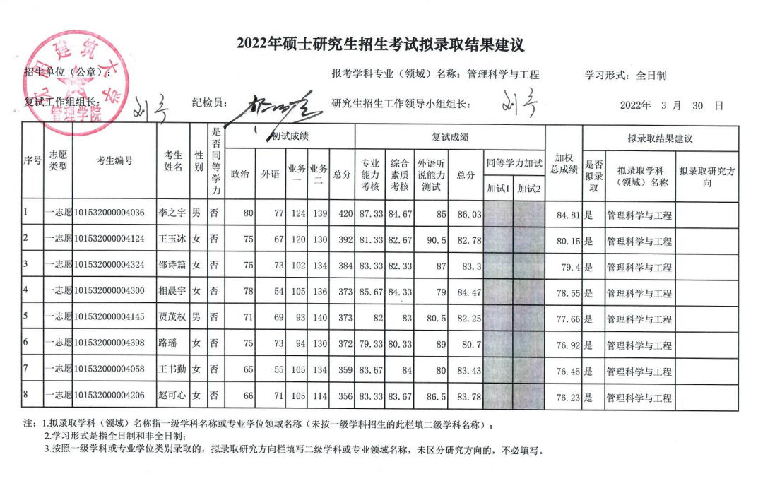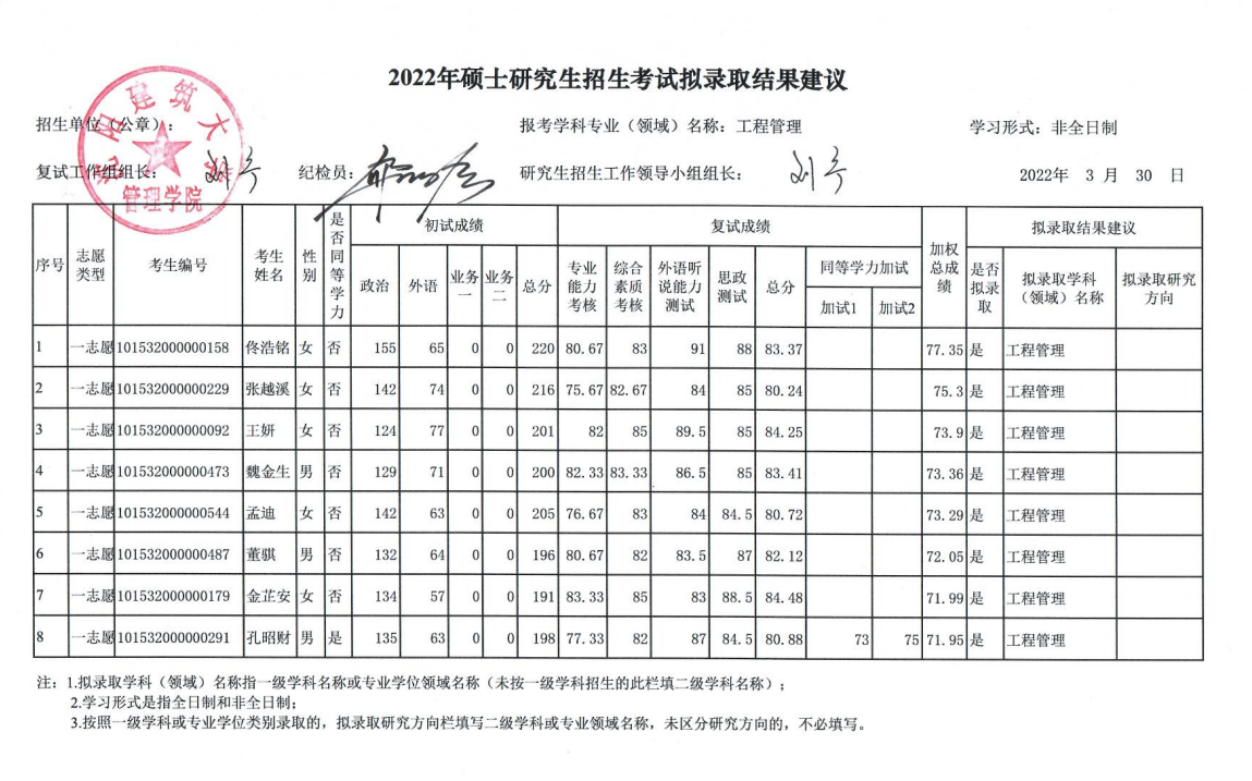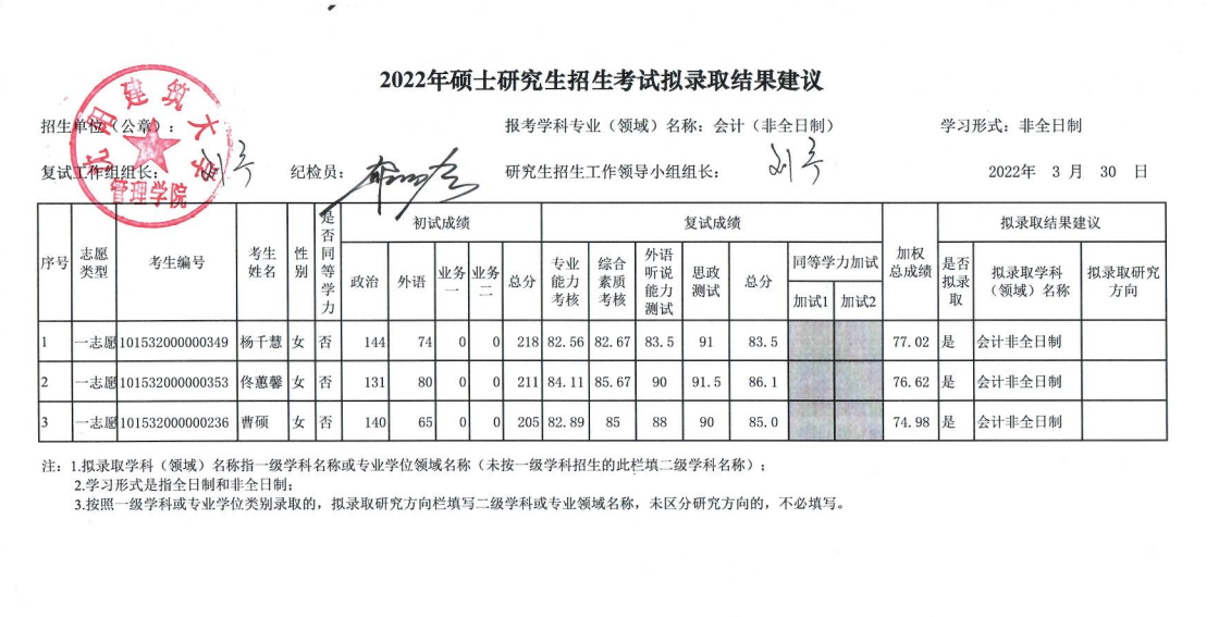 2022年硕士研究生招生考试拟录取结果建议