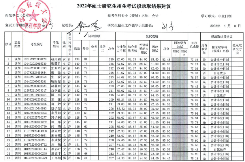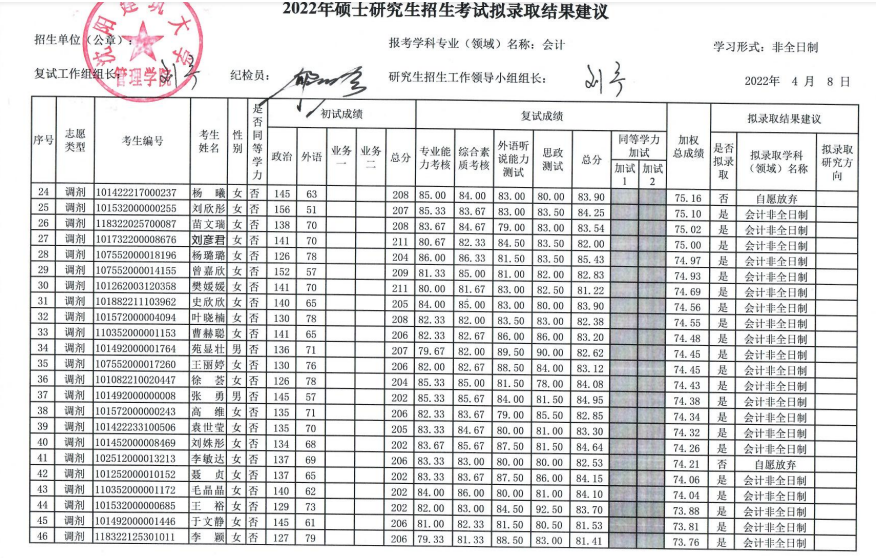 2022年硕士研究生招生考试拟录取结果公示-会计非全日制调剂