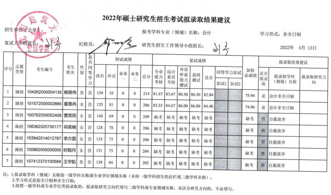 2022年硕士研究生招生考试拟录取结果公示-会计非全调剂