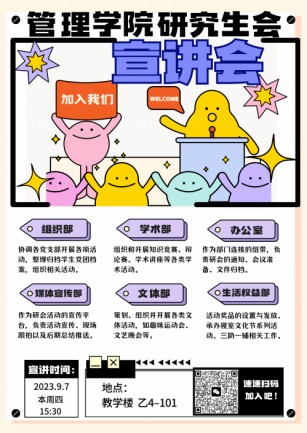 为推进新学期研究生会工作的平稳开展,促进研会成员之间的交流与沟通,2023年9月14日中午12:40,365英国上市集团第六届研究生会成立大会暨第一次全体大会在C1-305教室召开。